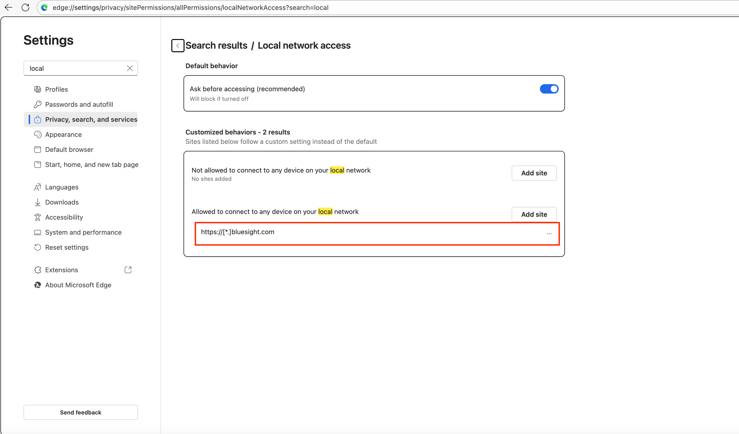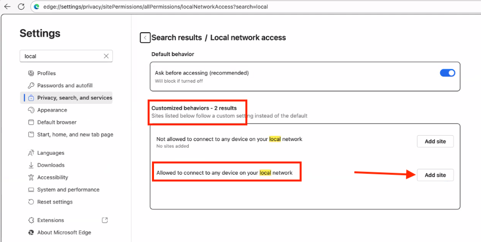 edge://settings/privacy/sitePermissions/allPermissions/localNetworkAccess - In the Customized behaviorssection, find theAllowed to connect to any device on your local networksetting & clickAdd site